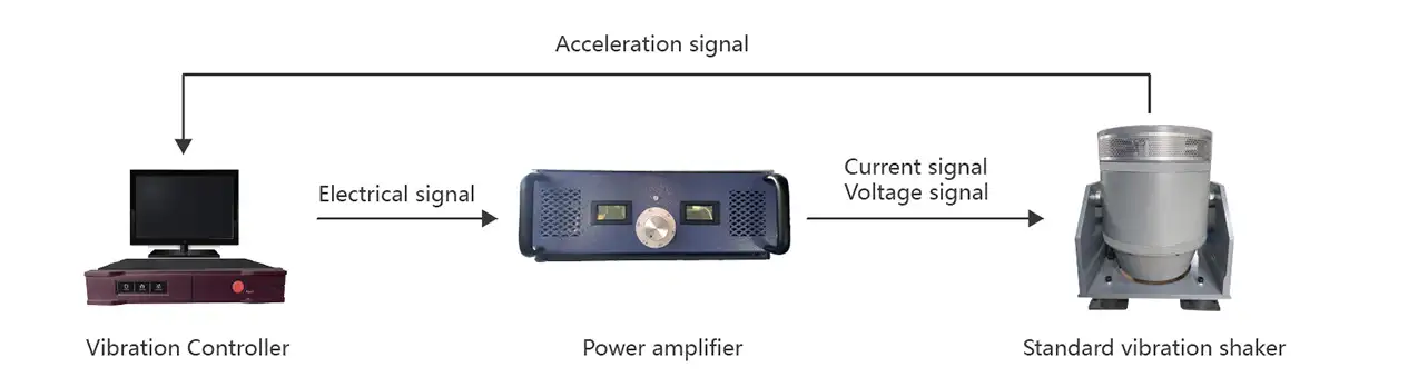 Vibration or shock motion is generated by the shaker in response to an amplified drive signal that originates at the controller. The accelerometer will provide the collected signal to the controller for real-time correction, and send back to the power amplifier.